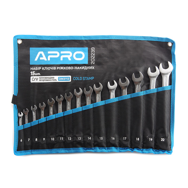 APRO Набір ключів ріжково-накидних Холодний штамп DIN3113 CrV 15 шт. (6-19, 22 мм)